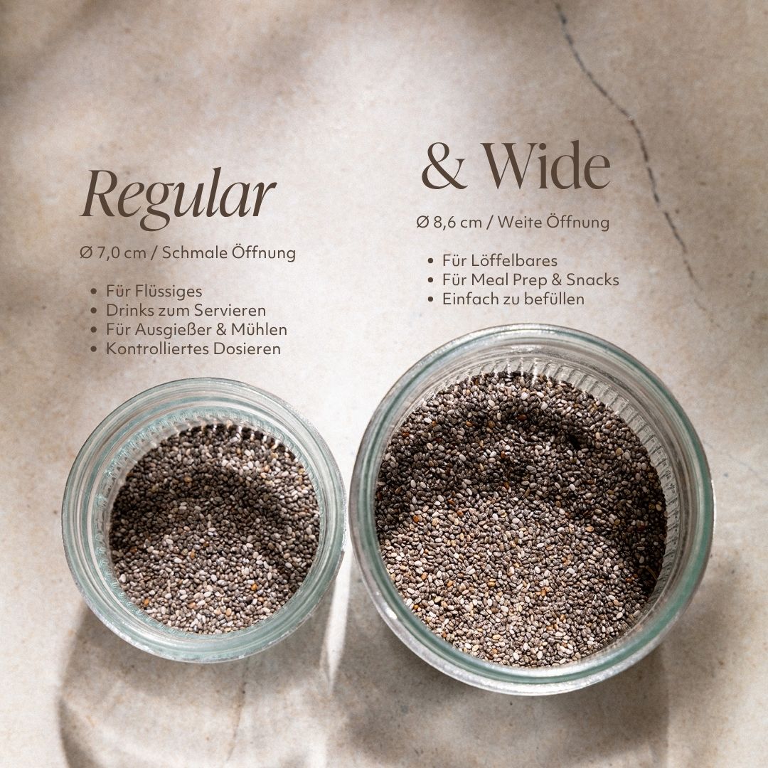 Regular und Wide bezeichnet die Größe der Glasöffnung. Die Glasöffnung ist maßgeblich für die Kombination vom Zubehör. Weitere Infos dazu findest du in unserem Mason Jar Guide.