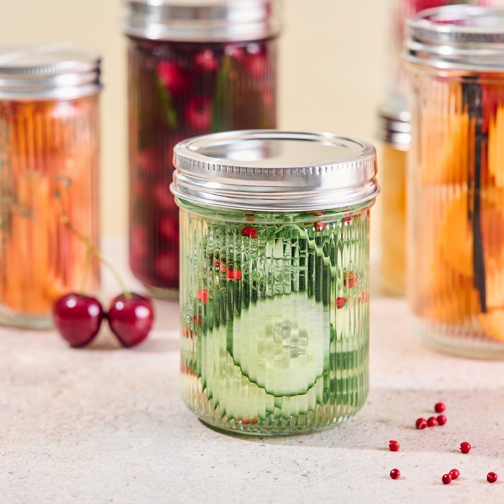 Wichtig: Dieses Set enthält ausschließlich Ripple Mason Jars mit Regular Öffnung. Es passt nur Regular Zubehör – Wide Mouth Zubehör ist nicht kompatibel.
