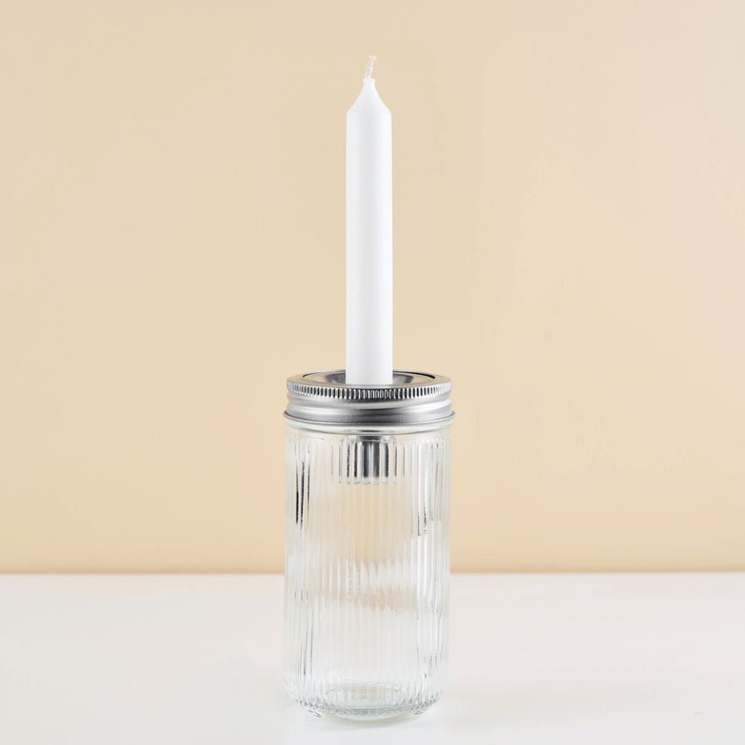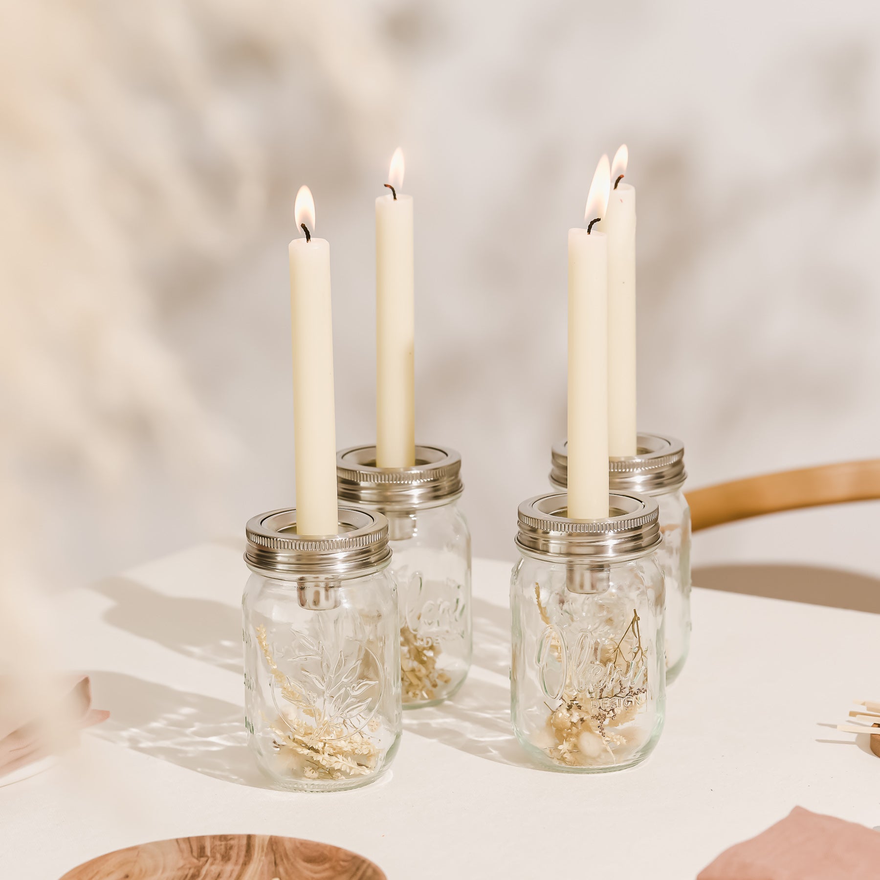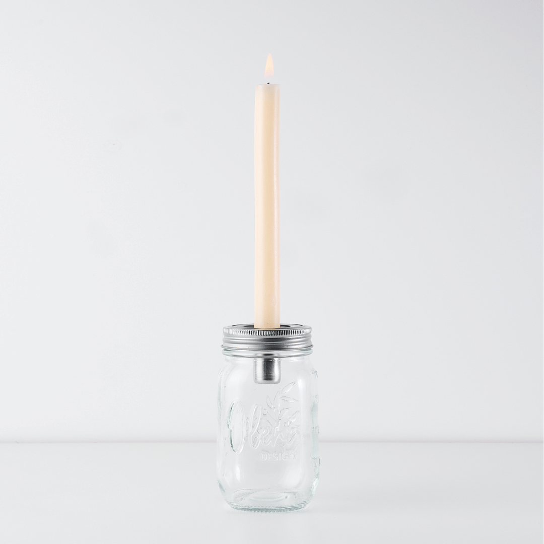 Combined with the candle holder, the Mason Jar glass becomes a decorative glass. Suitable decorations can be placed in the bottom of the glass, such as dried flowers, Easter eggs or olive branches. Pretty on the balcony or dining table in the living room.