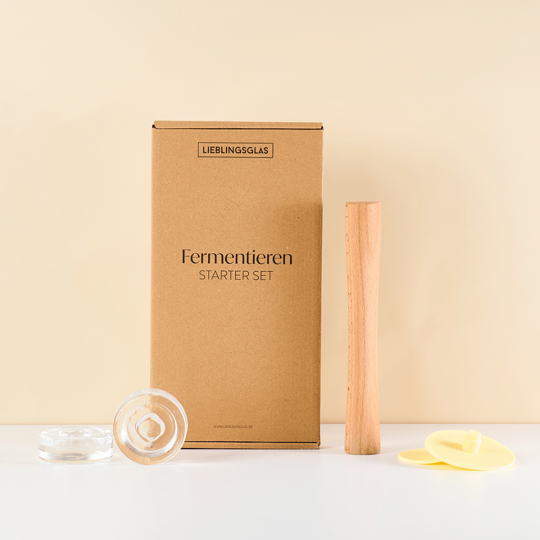 The starter set contains everything you need: attachments, glass weights, a tamper and recipes. The set is also available with matching Oleni glasses. With our LIEBLINGSGLAS fermentation attachments Gases and thus pressure can escape from the glass through the small valve without oxygen getting in. This keeps it sterile, no germs get into the glass and the vegetables are guaranteed to stay fresh. With the wooden masher you can mash your vegetables directly in the Oleni glass. The wooden stick is a perfect fit for Mason Jars. As a perfect addition, the kit includes Glass weights – this keeps the vegetables at the bottom and the liquid at the top. Make sure that only the brine is above the weight. The fermentation set is perfect for anyone who wants to start fermenting.