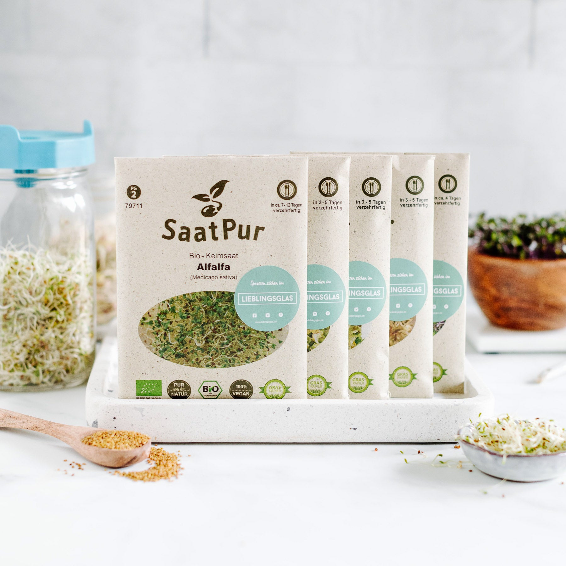 Sprouts are real nutritional bombs and are full of vitamins. Grown in your own LIEBLINGSGLAS, you can easily and inexpensively add them to your dishes, top them or use them to make delicious and fresh salads. Our organic sprouting seeds are 100% vegan, ORGANIC and come in environmentally friendly packaging made of grass paper.