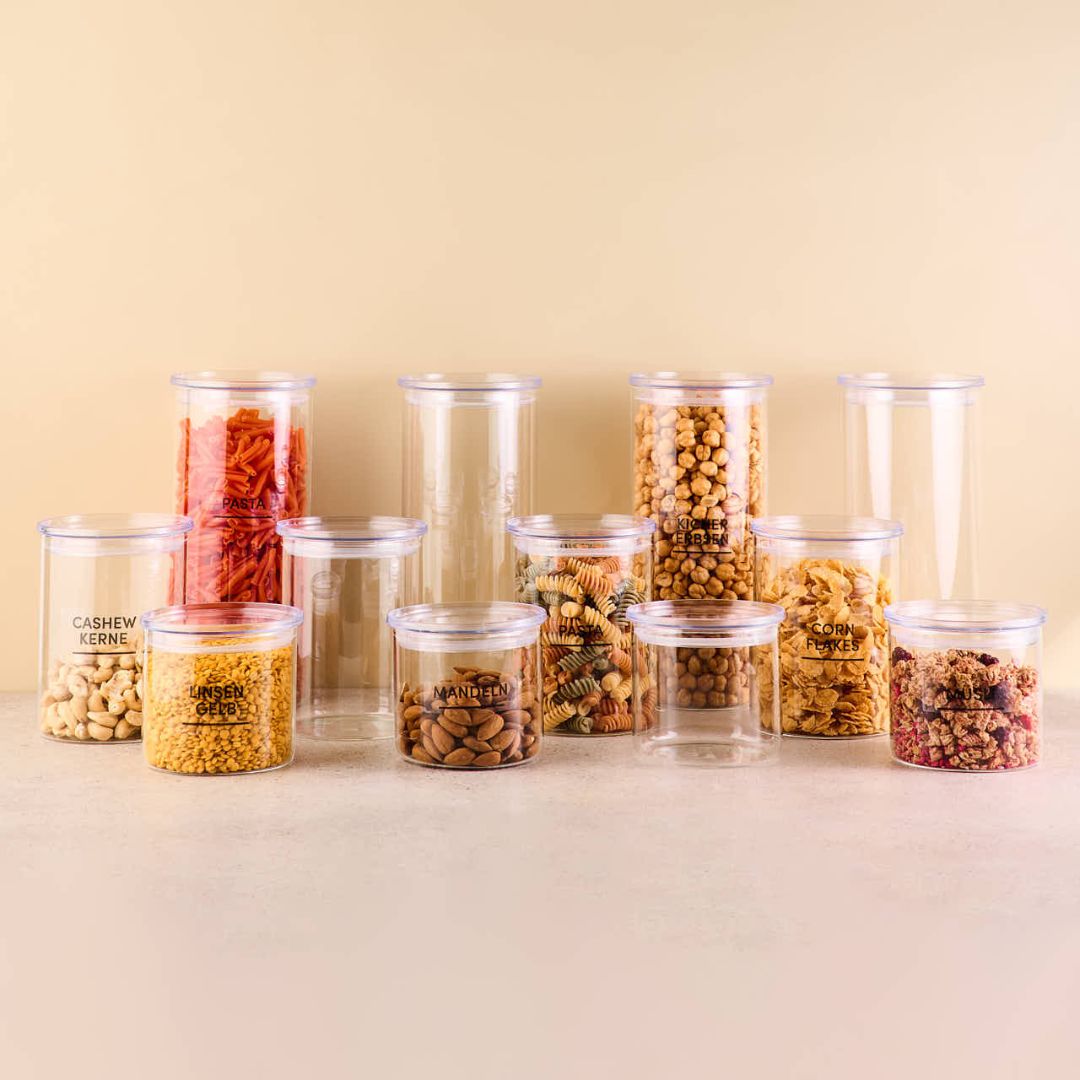 Die transparenten Acryldeckel sorgen für eine moderne und zugleich schlichte Optik, luftdichter Verschluss und volle Übersicht auf einen Blick – egal ob im Regal, in der Schublade oder auf deiner Arbeitsfläche.