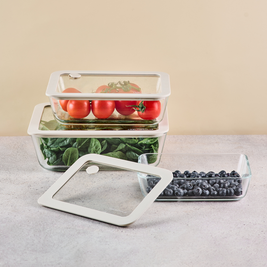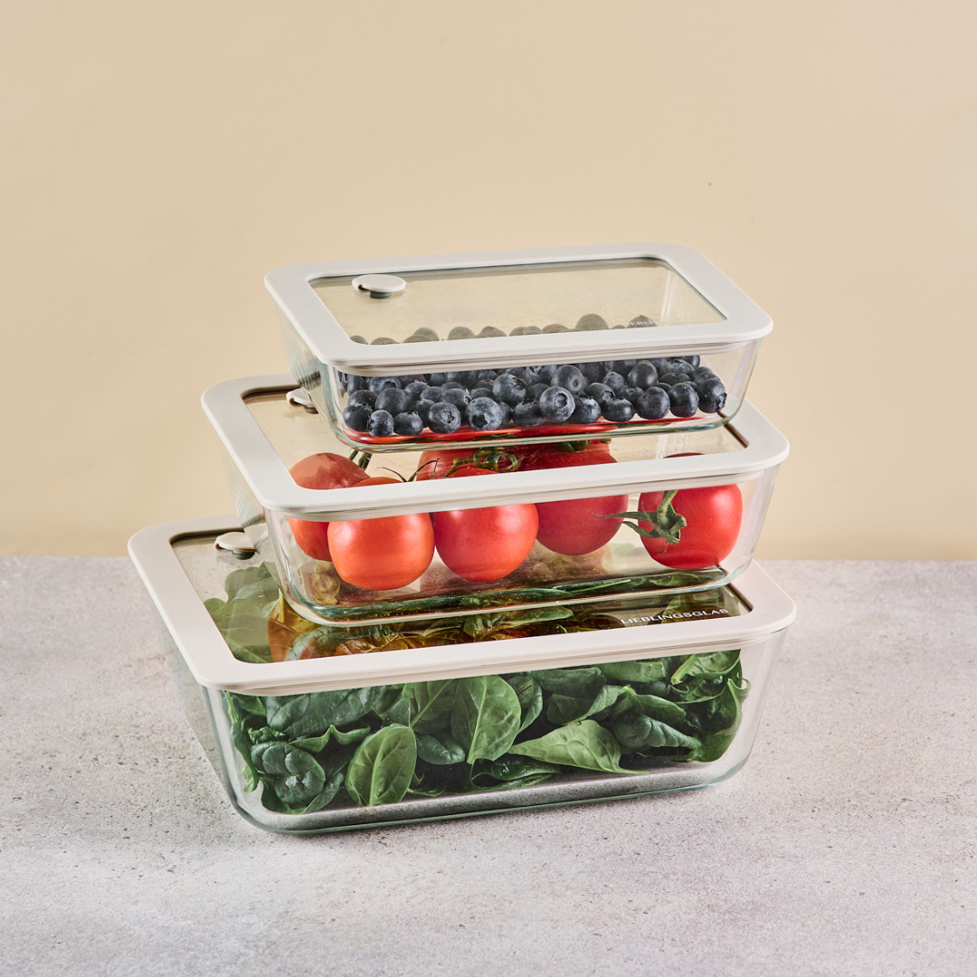 Unsere Frischhaltedosen machen Schluss mit matschigem Obst, labbrigem Salat und vergessenen Resten. Das integrierte Ventil drückt die überschüssige Luft raus – und hält wertvolle Nährstoffe, Textur und Geschmack länger im Glas. Mit unseren Frischhaltedosen bleiben deine Zutaten und dein Essen länger frisch – sichtbar, spürbar und clever aufbewahrt.